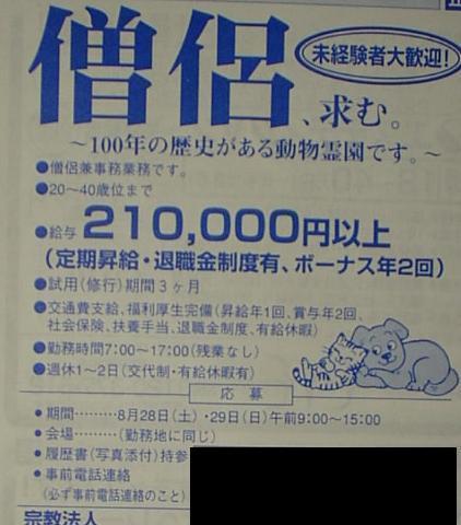 というところで、七夕である。で、こんな日に何気なく眺めていてみかけたのがこんな求人広告![]() 社会保険、扶養手当、福利厚生・・・冠婚葬祭対応もバッチリ(死語)か。 |