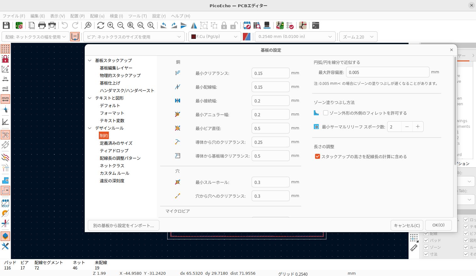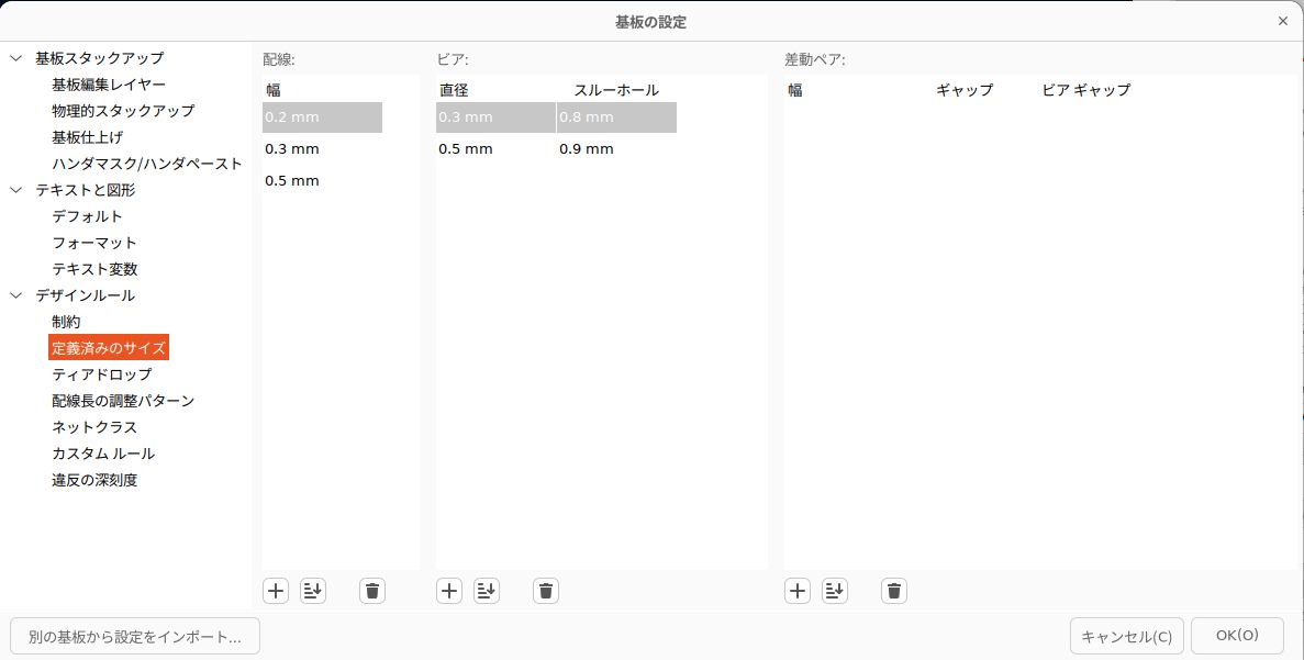 ・そういえば、デザインルールやら配線の幅やらビア径などを決めないといけないな。これはFile=>基板の設定の「デザインルール」にあった。P板さん、unicraftさん、きばん本舗さんあたりの資料を眺めて、だいたいこのあたりなら大丈夫だろうというところにしておく。