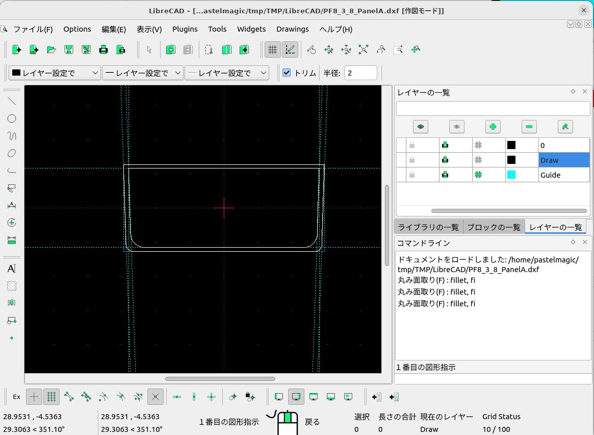 ・そんなところで、FreeCADでパネルの加工図面作成を試してみるか。とりあえずFreeCADでDraftモードにするとこんな感じ