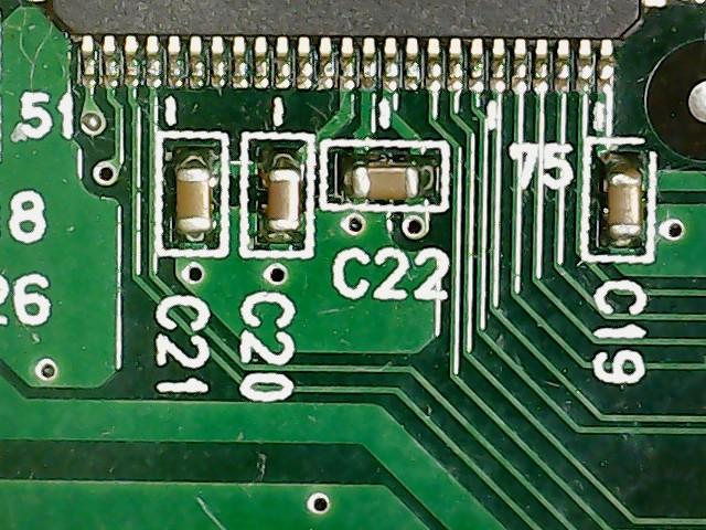・とりあえず、10cm強くらい離してPSoC5な基板を撮影してみたものがこれ。PSoC5の0.5mmピッチの足がここまで見られる。このくらい離してやると視野の窮屈さもそれほど感じないで済みそうだ。ピント合わせもそこまでシビアということはなくて、基板を5mmや1cm程度浮かせても見るのには問題ない。はんだ付けのときなどに活躍してくれそうかな。
