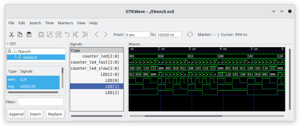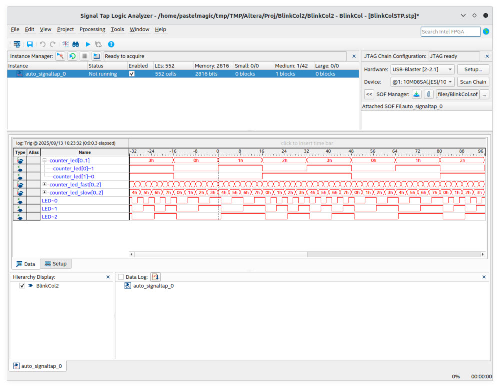 ・とりあえずIcarusVerilogのシミュレーションではうまくいっているようなので、QuartusでカラーLEDの点滅パターンを変えて書き込んでみたらうまく動いた。